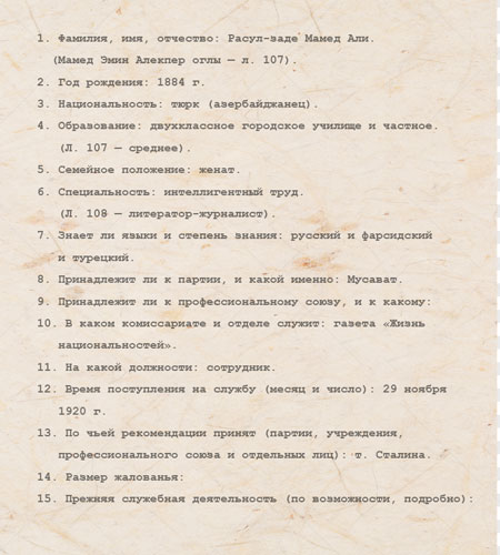 Mənbələrə müraciət edək. Yuxarıdakı anketlərin arxiv orijinallarında aşağıdakılar göstərilir: Rəsulzadə Məmməd Əli, 35 yaşlı, Azərbaycan vətəndaşı, Moskvada yaşayıb (Povarskaya küç., 29, mənzil 7), təhsili - ikiillik şəhər məktəbi və özəl, rus, fars və türk dillərini bilən, sosial vəziyyəti - "ziyalı əməyi", milliyyəti - türk (azərbaycanlı), 29 noyabr 1920-ci ildə Stalinin tövsiyəsi ilə işə qəbul edilib; Rəsulzadə Məhəmməd Əmin Ələkbər oğlu, 1884-cü il təvəllüdlü, azərbaycanlı, Moskvada yaşayıb (Povarskaya küç., 29, mənzil 7), təhsili - orta, dil - türk, fars və rus, sosial vəziyyəti - “ziyalı işi”, milliyyəti türk-azərbaycanlı, ixtisası “yazıçı-jurnalist”, 1920-ci il noyabrın 29-da Stalinin tövsiyəsi ilə işə qəbul edilib.